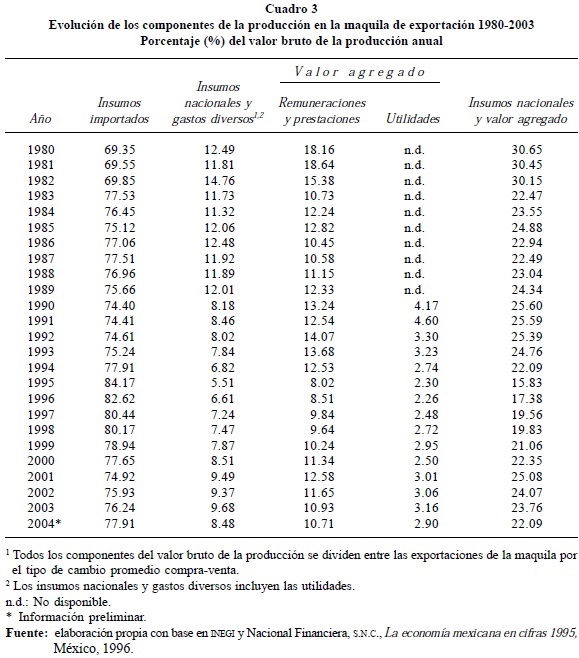 El tema de la articulación de la industria maquiladora con la economía nacional exige el análisis pormenorizado de sus principales componentes. En orden de importancia, primero los insumos importados, seguidos de los insumos nacionales y gastos diversos pagados localmente (en particular servicios y alquileres), las remuneraciones y prestaciones pagadas y, por último, las utilidades reportadas por la actividad. En términos agregados, también pueden descomponerse en dos grupos: insumos importados y los componentes nacionales: insumos locales y valor agregado. Por el momento, en el Cuadro 3, sólo nos interesa destacar que los insumos importados han representado en el periodo analizado entre 69.3 y 84.2% del total del valor de las exportaciones de la industria maquiladora; mientras que los componentes nacionales, insumos locales y valor agregado, han fluctuado entre 30.7 y 15.8% del total del valor de las exportaciones.