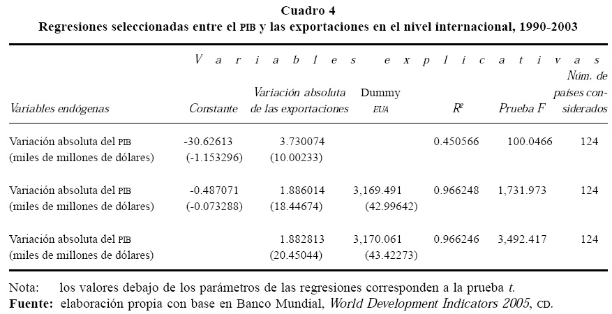 Las mejores regresiones lineales se muestran en el Cuadro 4, en el cual se observa en todos los casos un crecimiento de las exportaciones que genera una expansión positiva en el producto, aunque el parámetro de vinculación entre ambas variables sea diferente. En segundo lugar, es necesario señalar que en todas las regresiones los parámetros que vinculan las variables anteriores, en forma individual y conjunta, son significativamente diferentes de cero a 99% en cuanto a confianza. La bondad de ajuste de las ecuaciones, reflejada en el R2 es aceptable, elevándose en los casos en que incorporamos una variable complementaria dummy para Estados Unidos, ya que sus exportaciones crecen en poco más de US$ 330 miles de millones, mientras que su producto lo hace en US$ 3 792 miles de millones en el periodo analizado.24 Con el tratamiento particular a ese país, el multiplicador de las exportaciones al producto promedio internacional se ubica en 1.9 con una bondad de ajuste cercana a 97%. Una variación absoluta real de las exportaciones en us$ 100 millones, de conformidad a la evidencia empírica internacional, conduciría a un crecimiento del producto real en aproximadamente US$ 190 millones.