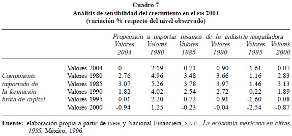 Obviamente, al asumir la propensión a importar y el componente importado de la formación bruta de capital de 1995, resultaría un menor nivel de actividad económica que el observado, por las mayores filtraciones de la demanda agregada hacia el exterior, tanto por el lado de las importaciones de insumos de la industria maquiladora como por las mayores importaciones de bienes de capital.