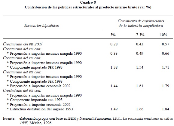 El modelo nos permite considerar cuatro parámetros estructurales: propensión a importar insumos de la industria maquiladora, componente importado de la formación bruta de capital, propensión a importar del resto de actividades económicas y estructura de la distribución del ingreso nacional. En todos los casos se asumirían valores hipotéticos similares a los históricos, medianamente positivos-intermedios29 y que no son los mejores del periodo analizado. En el Cuadro 8 se observa que cada uno de éstos implicaría una contribución positiva al crecimiento del producto, siendo el más importante la reducción del componente importado de la formación bruta de capital y de la estructura de distribución del ingreso (mayor participación de las remuneraciones en el ingreso-producto nacional) a niveles de 1993.