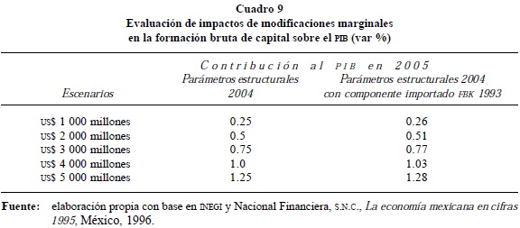 En el Cuadro 9 se observa qué incrementos marginales de la inversión implicaría un aumento de la inversión. Si éste es de 1 000 millones US$, el crecimiento económico es del orden de 0.25 puntos porcentuales del PIB en 2005; si la inversión crece en US$ 3 000 millones, el incremento del producto es de 0.75 puntos porcentuales, y cuando es de US$ 5 000 millones, de 1.25 puntos porcentuales con los parámetros estructurales de la economía mexicana observados en 2004. Si el componente importado de la formación bruta de capital es menor (similar a 1993), los efectos en el crecimiento económico son ligeramente superiores. Es importante comentar que aún en este último caso, el impacto en el crecimiento económico sería menor al que se generaría cuando las exportaciones de la industria maquiladora crecieran sólo a 5% anual, pero se incorporen todas las políticas en los parámetros estructurales que permitan mejorar su integración con la economía nacional.