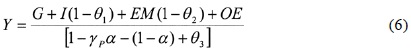 En este modelo simple supondremos que sólo una fracción de la formación bruta de capital se lleva a cabo en bienes de origen nacional (CNI) que activan la demanda y bienes de capital (MBK). Asimismo, las exportaciones son la suma de las realizadas por la industria maquiladora (EM) y de las otras exportaciones (OE). Las importaciones que realiza la economía mexicana incluyen las importaciones de bienes de capital, tanto de la industria maquiladora, como del resto de la economía, las importaciones de insumos de la industria maquiladora que son una proporción de las exportaciones (θ2) y de las otras importaciones de la economía que dependen del nivel de producto-ingreso (θ3).