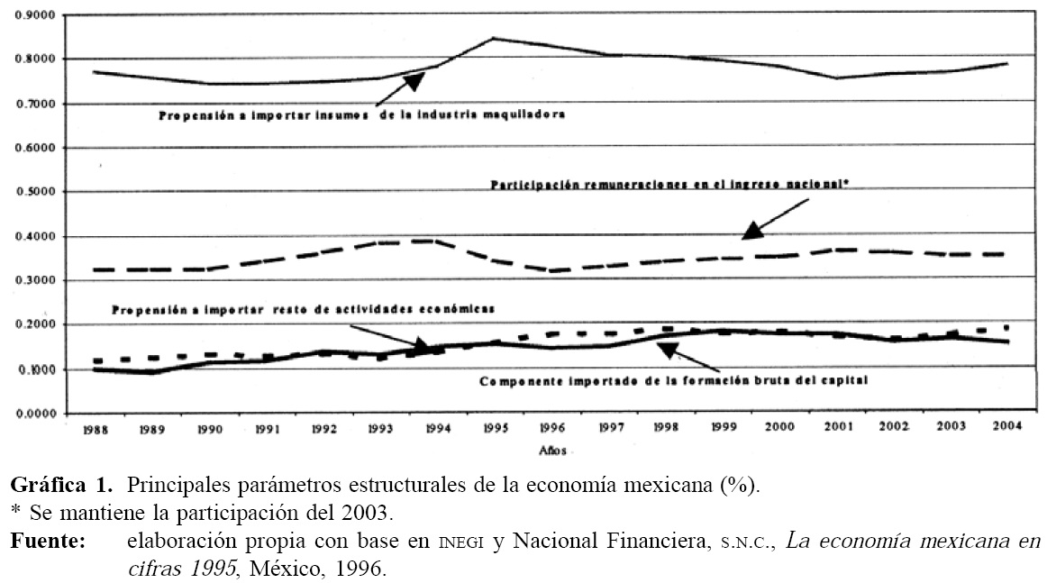 En la Gráfica 1 se presentan algunos de los parámetros estructurales que serán utilizados cuando se analice la contribución de la industria maquiladora al crecimiento económico. Al respecto, destacan la propensión a importar insumos de la industria maquiladora, el componente importado de la formación bruta de capital, la participación de las remuneraciones en el ingreso nacional y la propensión a importar del resto de actividades económicas. En todos los casos esos parámetros cambian en el tiempo como resultado de elementos técnicos (naturaleza de los procesos productivos y tecnologías), modificaciones en los precios relativos (evolución de los precios al consumidor, tipo de cambio), factores externos (precios internacionales), su interacción, mayor o menor poder relativo respecto de otros actores (salarios nominales relativos a los precios) y por la implantación de políticas públicas (macroeconómica-fiscal-comercial-cambiaria-monetaria, meso o sectoriales, microeconómicas, ingresos-salarios mínimos, entre otras).