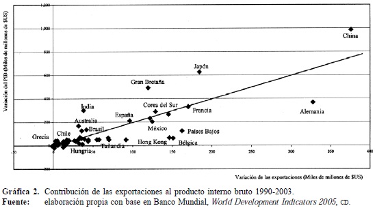 Con independencia del enfoque teórico, es evidente que el desempeño del sector exportador contribuye al crecimiento del producto interno bruto. Al respecto, con base en la información del Banco Mundial23 se evalúa la contribución de la variación absoluta de las exportaciones reales a la variación del producto real entre 1990 y 2003 para 124 países en los que existe toda la información estadística.