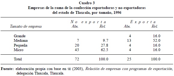 El Cuadro 3 presenta las 97 empresas de la confección divididas en exportadoras y no exportadoras, de las cuales sólo 25 exportan directamente. Las empresas más exportadoras son las grandes y, sobre todo, las medianas; mientras sólo cuatro de las microempresas exportan. Más llamativos son los datos concentrados en el Cuadro 4, en el cual se pueden apreciar los elevados porcentajes de incremento experimentados entre 1996 y 2003 por todos los tipos de firmas exportadoras, con excepción de las maquilas de exportación las cuales disminuyeron 57%.