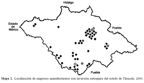Como se ha señalado, esta diversidad productiva no se ve correspondida por la distribución geográfica, pues la mayoría de las empresas se concentran en la zona centro-sur del estado de Tlaxcala. Las empresas que se localizan en otros municipios se ven atraídas por la cercanía al Distrito Federal, en el caso de Calpulalpan, o por el parque industrial de Tetla, en el caso de los municipios norteños.