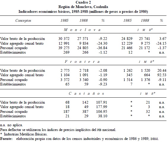 En suma, la crisis de los ochenta, junto con los procesos de reestructuración, condujo a la economía regional a registrar tendencias negativas en sus principales indicadores. En efecto, si tomamos 1980 como año base para observar el comportamiento de los precios, "Monclova registró 289.5% de incremento en 1982, 544.8% en 1983 y alcanzó la cifra de 2703.5% en 1986" (Cárdenas, 1992:166). Aunque dicha conducta no fue privativa de Monclova, en esta región tuvo un impacto profundo como resultado de su alta especialización en la elaboración de productos de acero, como puede observarse en el Cuadro 2. Para la ciudad de Monclova representó 82% en 1985, y en lugar de reducirse, se incrementó a 93% en 1998.6