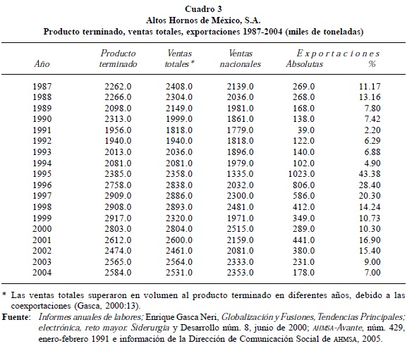 En suma, las inversiones acumuladas por el GAN desde la toma de posesión alcanzaron aproximadamente 1 850 millones de dólares, la mayor parte con la banca extranjera y los mercados financieros. En efecto, AHMSA volvió a cotizar en la Bolsa Mexicana de Valores en diciembre de 1993 para captar capital de riesgo, lo cual le permitió mantener sus indicadores financieros en mejores niveles que el resto de las empresas siderúrgicas en América Latina.8 La crisis financiera de 1995 modificó la paridad peso-dólar, favoreciendo las exportaciones (Cuadro 3) y contratos de abastecimiento a largo plazo, que se cancelaron con la crisis asiática de 1997-1998; en otras palabras, la desgravación arancelaria y otras medidas de fomento a las exportaciones tuvieron un éxito de corto plazo, así lo muestra la tendencia de las exportaciones después de 1995; las de 2004 registraron un porcentaje similar al de 1990.