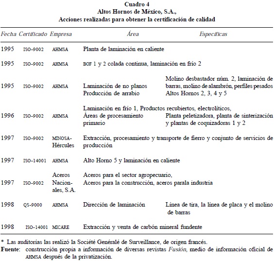 En ese periodo de incertidumbre financiera, un endeudamiento excesivo (deuda total entre activos totales) conduciría a la quiebra a cualquier empresa con problemas para colocar sus productos en el mercado. AHMSA registró en 1998 67% (Zúñiga, 2003:175, 235), lo que los analistas financieros consideraron riesgoso para el sano desempeño de la siderúrgica. Esos niveles de endeudamiento, compaginados con las restricciones del mercado generadas por la crisis asiática, condujeron al incumplimiento del pago con los acreedores, quienes reaccionaron con demandas judiciales y AHMSA se declaró en suspensión de pagos en mayo de 1999. No obstante, todas esas deudas permitieron modernizar la compañía y obtener las certificaciones de calidad internacional10 en varios departamentos; el de Laminación en Caliente, el más olvidado en los tiempos de empresa paraestatal, obtuvo la primera en enero de 1995. Posteriormente, obtuvieron dicha certificación los Departamentos de Laminación en Frío, las acerías BOF 1 y 2, la Colada Continua, entre otras; la mina Hércules, que la abastece de mineral de hierro, obtuvo esta certificación en 1997, y MICARE, la cual obtiene carbón fundente para la Comisión Federal de Electricidad, en 1998 (Cuadro 4). Todos esos cambios hicieron crecer la producción de acero líquido y el uso óptimo de la capacidad instalada existente.