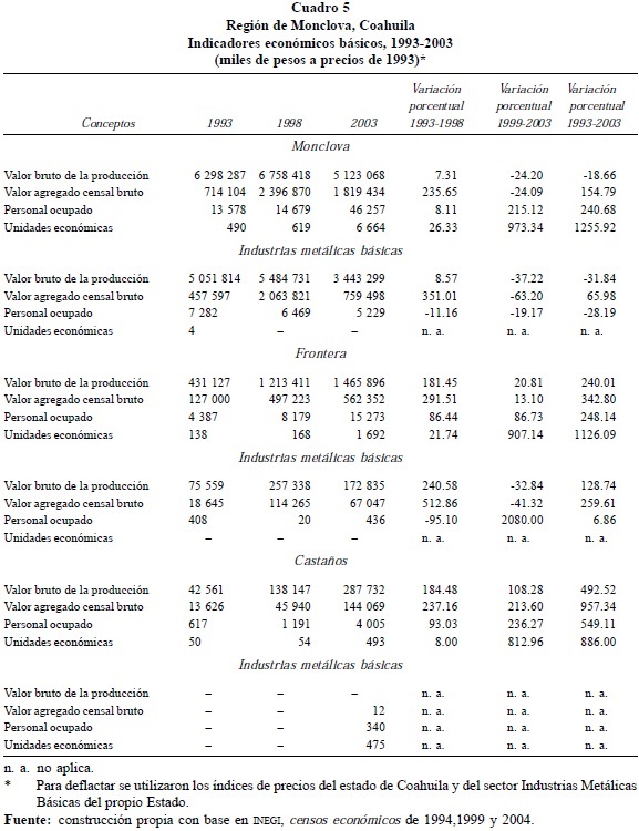 De las tres ciudades conurbadas (Monclova, Frontera y Castaños) que conforman la región de Monclova, la primera registró los saldos más negativos del proceso, como se puede apreciar en el Cuadro 5; estos saldos se registraron después de la crisis asiática y la suspensión de pagos de 1999. Entre 1993 y 1998 el único indicador negativo (11.16%) se observa en la planta laboral del sector de industrias metálicas básicas, el cual representó 70.80% del valor total de la producción de dicha ciudad en 1998, que bajó a 52.59% en 2003.