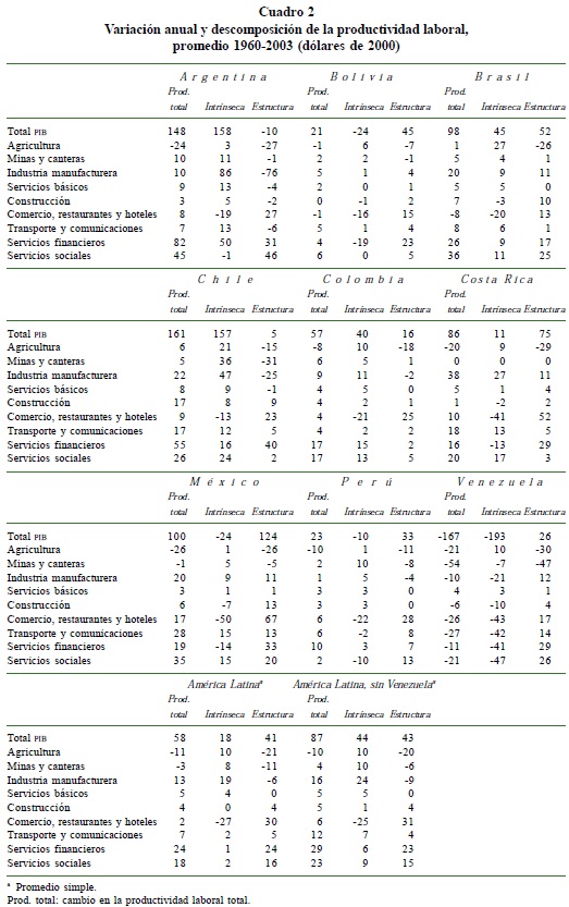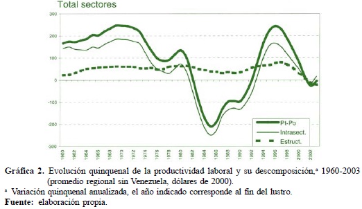 Se observa también una gran variabilidad de las tasas de crecimiento anual de la productividad laboral, entre los países o en el tiempo. El efecto de la recomposición estructural de la fuerza de trabajo es un factor muy importante en la variación total del producto por empleado, sobre el conjunto del periodo 1960-2003 (Cuadro 2). Esta variable estructural explica 70% del cambio regional promedio (49%, excluyendo a Venezuela). Subrayando la validez analítica del modelo de Lewis en la región, se observa que una mitad de esas ganancias provienen de la recomposición de la fuerza de trabajo agrícola: la expulsión (en términos de pérdida de participación en el empleo total) de empleos agrícolas causó una pérdida de potencial equivalente a 35% del aumento de productividad total, mientras su productividad intrínseca subió y aportó 17% del aumento total (23% y 11%, respectivamente, si se excluye a Venezuela).