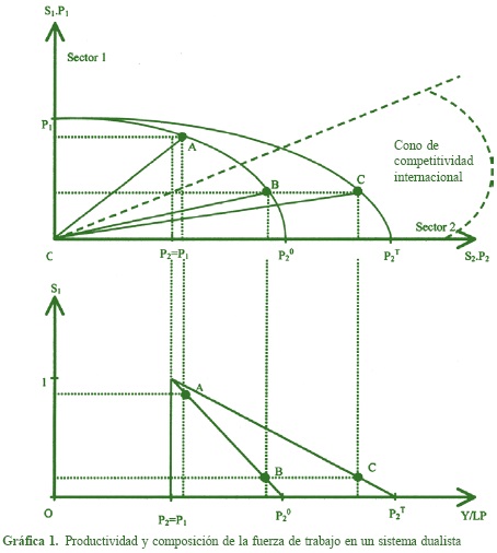La metodología de descomposición que empleamos en este ensayo se inspira de la corriente dualista. Consideramos una economía con dos sectores de producción, el primero tradicional y de baja productividad del trabajo (S1), el segundo moderno y de productividad alta (S2).