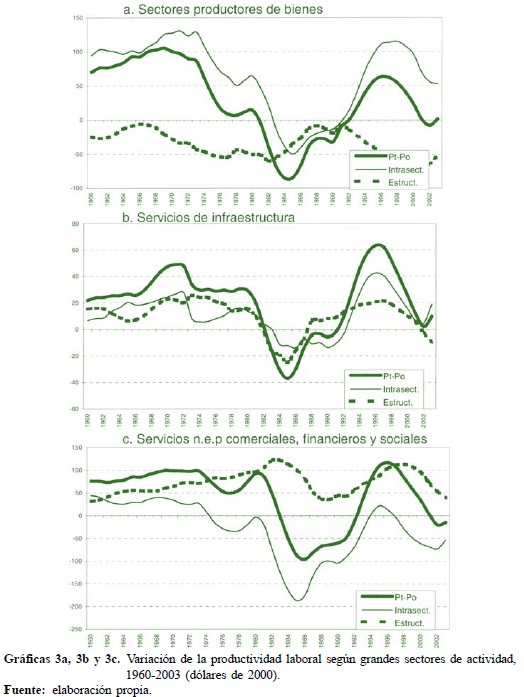 Se observa también que la profunda crisis iniciada con la deuda de 1982 dañó el componente intrínseco, sin afectar mayormente las ganancias productivas provenientes de la recomposición estructural. El colapso productivo tocó fondo en 1984; sin embargo, la variación de productividad se vuelve positiva solamente después de 1991, justificando el calificativo de década perdida que se dio a este periodo.