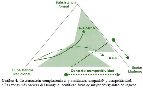 En muchos aspectos, entonces, la terciarización en América Latina es sustitutiva de la industrialización y consolida los patrones de polarización social. Como persisten al mismo tiempo rasgos importantes del anterior sector tradicional, en particular en las poblaciones rurales marginales e indígenas, podemos caracterizar la situación latinoamericana como trialismo. La Gráfica 4 sintetiza en un esquema triangular la dinámica diferencial de Asia y América Latina.