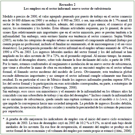 Buena parte de los empleos de refugio creados en el sector comercial son de mala calidad e informales (trabajo negro, autoempleo), que no corresponden al sector moderno de Lewis. Estamos presenciando entonces un quiebre del proceso de convergencia hacia el mundo de unificación a la Solow de los mercados de trabajo y de capital. Esto se puede atribuir a una agravación del proceso de informalidad, como estrategia de subsistencia que adoptaron los más vulnerables para enfrentar los efectos de la crisis. Este fenómeno está presente con varios grados de agudización en todos los países de la región, promoviendo una nueva forma de dualismo productivo y social (Weller, 2005; Cimoli et al., 2006; Ros, 2005). Este enfoque multisectorial concuerda también en sus principales conclusiones con una investigación reciente sobre la curva de Kuztnets en la región (Sánchez, 2006).