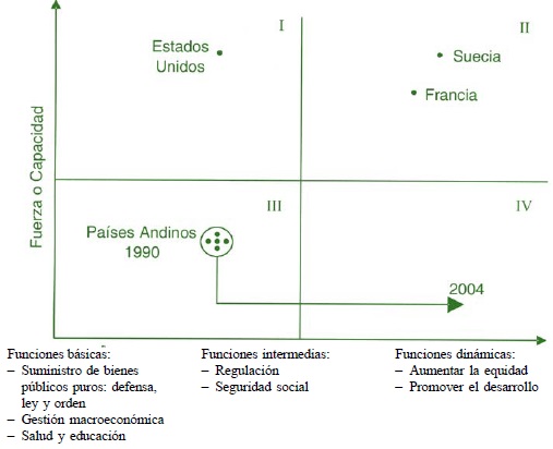 Bien puede ocurrir, sin embargo, que la expansión del Estado en el plano interno de los países andinos se haya dado más en la dirección de ampliar la gama de las funciones públicas que en el sentido de aumentar su fuerza o capacidad. Fukuyama la define como: "Capacidad de elaboración y ejecución de políticas y de promulgación de leyes; administración eficaz con la mínima burocracia; control del soborno, la corrupción y el cohecho; reconocimiento de un alto nivel de transparencia y rendición de cuentas en las instituciones públicas; y lo más importante, el cumplimiento de las leyes".