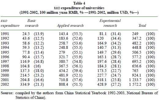 Of all the forms of linkage, technology service contracts have become a major source of research funding for research institutes and universities. In research institutes and universities, researchers are highly motivated to look for cooperation from enterprises by signing technology service contracts. An examination of the R&D spending of Chinese universities (see table 4) reveals that a very high percentage of their spending is on applied and experimental research (more than 80 percent). It is expected that most of this spending is funded by industry through different forms of technology contracts.