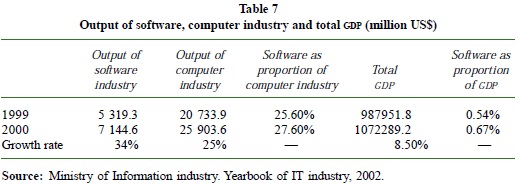 China's hardware industry has been doing very well during these years. In 2002 and 2003, it was the second largest in the world. Although the development of software has not been so fast, it has also been on a rising trend over the years. For the present, the software industry has become a large proportion of China's computer industry, but is still a very small proportion of the country's GDP. The development started accelerating after the promulgation of "Policies regarding the Development of the Software Industry and the Integrated Circuit Industry" in 2000. In 2004, the output of China's software industry amounted to US$ 27.8 billion, with an average increase of 30% since 1999.