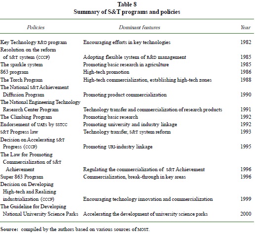 Government policies and programs have been the orienting force for the development of high technology in China. Table 9 summarizes the National policies and program. Some of the policies we have discussed in previous sections. The programs worth mentioning here are the "National S&T Achievements Diffusion Program", "the National Engineering Technology Research Center Program", the "863 Program" and the "Torch Program". The "National S&T Achievements Diffusion Program" was set to mobilize technological achievements in 1990. In addition, as continued efforts to promote technology transfer and commercialization of research products from academia, measures such as cutting financial support and granting greater autonomy to research institutes from central government, were adopted. The enforcement of "The National Engineering Technology Research Center Program" in 1991 was one of such efforts.