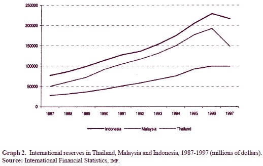 All the elements of this theoretical causal chain were present in Asia-3. First, net capital inflows increased significantly starting in 1988, and particularly in the years closer to the 1997 financial crises (most notably in 1995). In Thailand, total net capital inflows (as reflected in the financial balance of the International Monetary Fund's International Financial Statistics, IFS hereafter) were 20 times higher in 1995 than in 1987 ($1.1 billion in 1987; $21.9 billion in 1995). In Malaysia, they went from negative $2 billion in 1988 to $10.9 billion in 1997. And in Indonesia, capital inflows were almost five times higher in 1996 than in 1988 ($2.2 billion in 1988; $10.8 billion in 1996) (see Graph 1). There is some empirical evidence that these inflows were in part the consequence of stabilization and liberalization packages implemented mostly since the 1980s (Chuhan et al., 1993; World Bank, 1997).