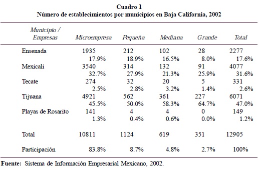 No obstante, el dominio en la estructura empresarial no le pertenece a la gran empresa, sino a una fuerte concentración de microempresas que se ubican en las diferentes ramas de la actividad económica. Los datos del Cuadro 1 indican que del total de empresas, 83.8% corresponde a la clasificación de microempresas que se distribuyen en los diferentes sectores de la economía, siendo el sector comercio donde más proliferan. La estructura empresarial del estado se reproduce de manera muy similar en los diferentes municipios. En el caso de Tijuana, ese comportamiento se explica, en parte, por su cercanía con el condado de San Diego, que ha provocado una vigorosa dinámica empresarial, y a la incesante llegada de residentes de otras partes de la república en busca de oportunidades, y en el caso de Mexicali, obedece, en buena medida, al hecho de ser la capital de la entidad y a su desarrollo agroindustrial. Cuarenta y siete por ciento del total de las empresas del estado se concentra en el municipio de Tijuana y 31.6% en Mexicali.
