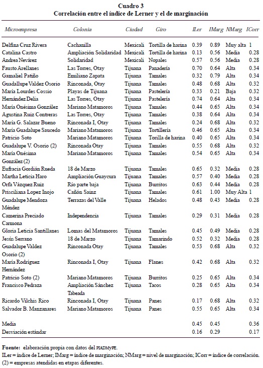 El Cuadro 3 muestra que de las 29 microempresas analizadas, 69% se encuentra ubicado en colonias que corresponden a una clasificación de marginación alta y muy alta. De acuerdo con este cuadro, la media del índice de Lerner en la muestra fue de 0.45 con 38% de las observaciones mostrando un valor por encima de este valor medio, lo que da una primera evidencia estadística en favor de la hipótesis planteada en este trabajo, el cual sostiene que microempresas con características de marginación son capaces de generar cierto poder monopolístico en sus nichos de mercado. Ello indicaría que ésta no es una cualidad exclusiva de las grandes empresas, sino que también puede ser encontrada en mercados pequeños donde la dimensión, localización e infraestructura y otras manifestaciones de la marginación le podrían estar confiriendo cierto poder de mercado. Otro resultado importante es que la correlación entre el índice de Lerner y el grado de marginación es más fuerte a medida que el nivel de marginación crece.