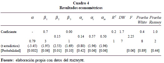 Los resultados econométricos se muestran en el Cuadro 4, en el cual se puede apreciar que son significativos estadísticamente, pues la prueba de White señala que el problema de heteroscedasticidad, que puede ser normal en ejercicios de corte transversal, está ausente. Ello permite rechazar la hipótesis de resultados espurios. De igual forma, la prueba de Ramsey permite deducir que existe una correcta especificación del modelo, a pesar de no tratarse de un modelo totalmente teórico, sino deducido empíricamente del comportamiento de estas empresas. En todo caso, la teoría neoclásica afirmaría que estas empresas por su tamaño, capacidad productiva y nivel tecnológico son incapaces de poseer poder de mercado.