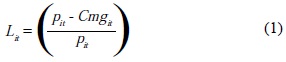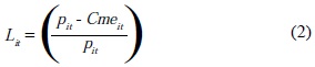 en la cual, para el momento t, Lit equivale al índice de Lerner de la microempresa i; pitrepresenta el precio del producto de la microempresa i, y Cmgit es el costo marginal en que incurre la microempresa i. Si bien es cierto que Lerner propone tomar en cuenta el costo marginal como una medida de desembolso económico empresarial, Huergo (2001) menciona que debido a la inobservabilidad de éste y en el supuesto de rendimientos constantes a escala, el índice de Lerner puede ser construido con base en los costos medios (Cme). De esa forma, la medición se vuelve empíricamente más conveniente para no poner en riesgo la confiabilidad del análisis. Por tanto, el índice de Lerner en este estudio queda representado por la siguiente ecuación: