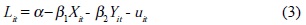 en la cual, Lit es el índice de Lerner de la microempresa i. Además, α, β1 y β2 son parámetros que representan el intercepto de la función, el primero, y el segundo y tercero miden la pendiente y la relación entre Lit y dos vectores de variables Xit y Yit. El primero de esos vectores representa las variables endógenas que pueden incidir en la capacidad de la empresa para adquirir poder de mercado, el cual incluye el índice de productividad de los trabajadores, la educación del dueño y la capacidad productiva de la empresa, representada por la diferencia entre la producción óptima que permite minimizar los costos medios de la empresa en el corto plazo y la producción promedio por jornada laboral.