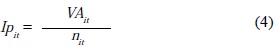 en el cual, para el momento t, Ipit es el índice de productividad de los trabajadores de la empresa i; VAit mide el valor agregado total de la empresa; i y nit constituye el número total de trabajadores de la empresa i.
