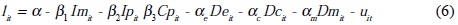 Una vez estimadas las variables de cada uno de los vectores de variables, se aplicó logaritmo en aquellas donde fue posible con el fin de minimizar la varianza y normalizar las series. El modelo a estimar se representa mediante la siguiente ecuación:
