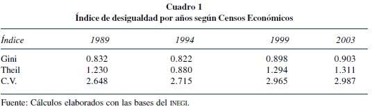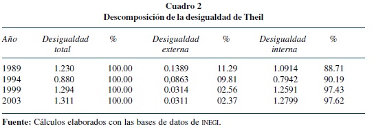 En el cuadro 2 se muestra el índice de desigualdad de Theil descompuesto en tres componentes: total, externo e interno.21 En términos generales, observamos que en el índice global la principal causa de la desigualdad es la interna.