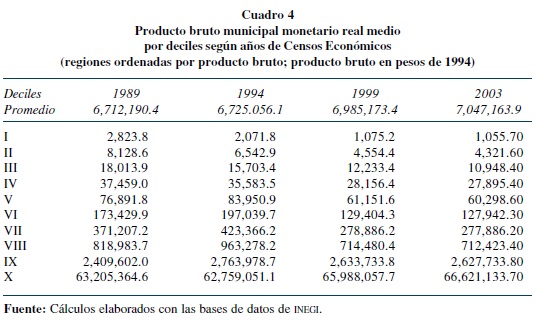 En el cuadro 4 se aprecia que el producto municipal bruto (PMB) monetario promedio aumenta, en términos reales, no sólo por efecto de medidas de política económica nacional, sino también por reacción de los mismos municipios utilizando los medios a su alcance para mantener o incrementar su nivel de actividad económica.