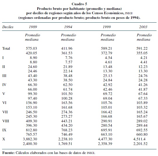 En general, el cuadro muestra que en la mayor parte de las mesorregiones las disparidades regionales aumentan a lo largo del periodo 1989-2003. En concreto, destaca el importante incremento registrado en la desigualdad interna por la región sur-sureste y centro, así como que éstas presentan niveles de desigualdad interna superiores a la media nacional. En tanto, el resto de las mesorregiones presenta menores índices de desigualdad interna, y es especialmente llamativa la situación del noroeste a este respecto.
