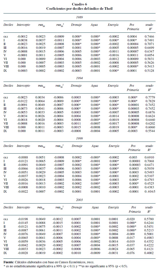 A continuación, después de revisar las mesorregiones y de clasificar los municipios en función de su PMB por habitante, vamos a evaluar si los patrones de desigualdad entre municipios ricos y pobres están relacionados con su nivel desarrollo económico. Para ello empleamos un modelo econométrico en el que el índice de desigualdad de Theil se expresa en función de la dotación de servicios públicos (agua, drenaje y electricidad), la educación posprimaria y del nivel inicial y del cuadrado del PMB por habitante estimado mediante una regresión cuantílica.