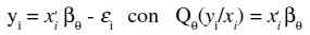 donde X, i es un vector de kx1 variables con X, i1 = 1, y β para todo i es un vector de parámetros conocidos kx1 cuya estimación para diferentes valores de θ (0 <θ< 1) es el objetivo. El término Qθ(yi/xi) denota el cuantil condicional de yi dado que xi en esta especificación y ε es definido por εi = yi - xi'βθ de donde se deriva Qθ(yi/xi) = 0. Por consiguiente, el cuantil θth de la regresión basada en la muestra (yi, xi) es un vector βθque reduce:
