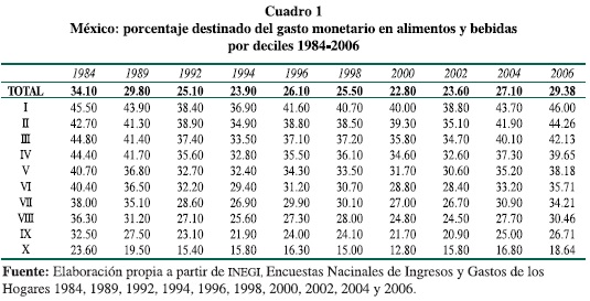 El deterioro de la producción agrícola y el escaso margen de gasto en alimentación, resultado de un ingreso exiguo en la mayoría de la población, explican que el patrón de consumo en México no manifieste cambios absolutos, sino modificaciones graduales donde la oferta se adapta a la modernización y cambios de hábitos en las ciudades, sin que se pierdan los niveles de vida reales, lo cual explica que sólo algunos productos mantengan una relativa continuidad en la base alimentaria (Ávila et al., 1996).