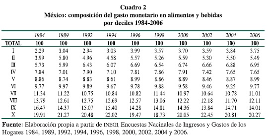 El análisis del consumo alimentario en la primera década del siglo XXI tiene importancia al menos en dos sentidos: a) la permanencia de una política económica excluyente que irradia beneficios sólo a un conjunto menor de la población, como lo expresan las tendencias de concentración del ingreso, además de que las medidas compensatorias no son suficientes para revertir el deterioro alimentario, y b) la presencia de un mercado abierto de bienes, con ofertas diversificadas, globalizado y con nuevas formas de distribución. Ambos factores definen algunos cambios en el patrón alimentario.