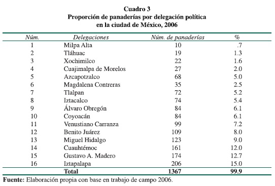 La distribución de panificadoras por tipo de establecimiento en la ciudad corresponde con los desplazamientos interiores que sigue la población de acuerdo con sus condiciones socioeconómicas. El mayor número y las de tipo tradicional conciernen a las zonas más populosas donde el pan es un producto básico y tiene un papel preponderante en la dieta. En cuanto a su ubicación por delegaciones, la mayor proporción está en Iztapalapa con 15%; Gustavo A. Madero, 12.7%; Cuauhtémoc, 12%; Miguel Hidalgo, 9%; Benito Juárez, 8%; Venustiano Carranza, 7.2%; Coyoacán, 6.1%; Álvaro Obregón, 6.1%; Iztacalco, 5.4%; Tlalpan, 5.2 %, y Azcapotzalco con 5%, que en conjunto suman 91.7% de las panaderías y pastelerías instaladas en la ciudad de México. Las restantes cinco delegaciones Magdalena Contreras con 2.5%, Cuajimalpa 2%, Xochimilco 1.6%, Tláhuac 1.3 y Milpa Alta con 0.7% alcanzan en conjunto sólo 8.1%, que en mucho se relaciona con las bajas densidades de población y el relativo aislamiento en cuanto a conexión con las principales vialidades de la ciudad.