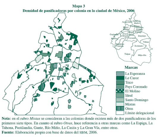 De lo anterior también se puede derivar que la distribución urbana de los establecimientos dedicados a la panificación en la ciudad de México, debido a la pervivencia de distintos tipos de empresas, observa en la actualidad una configuración heterogénea que se relaciona, por un lado, con los procesos de evolución de la expansión física de la ciudad y, por el otro, con los desplazamientos y redensificación de los distintos estratos de ingreso que se presentan recientemente al interior de la ciudad misma.