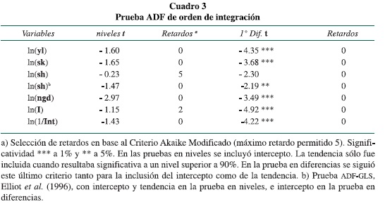 Antes de cualquier evaluación econométrica se verificará el orden de integración de las variables. A tal fin se aplicará la prueba Dickey-Fuller aumentada. En general, se utilizó el criterio de selección de rezagos basados en la propuesta de Akaike modificada. Sin embargo, en varias ocasiones se pudo observar que este criterio (y otros similares) no solucionaban el problema de autocorrelación o recomendaban la inclusión de una cantidad de rezagos superior a la necesaria para eliminarlo de dicha autocorrelación. En estos casos se procedió a incluir de forma manual el número de retardos necesarios para corregir esta falencia.