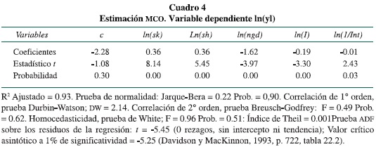 Los resultados de la regresión se presentan en el cuadro 4. Aquí se puede ver que el ajuste de la regresión es muy bueno, con un valor del R2 ajustado de 0.93 y un índice de Theil de 0,001, lo que estaría indicando un ajuste de regresión excelente. Por otra parte, se ha podido verificar la normalidad de los residuos, la homocedasticidad y la ausencia de correlación (de 1° y 2° orden), cumpliéndose así los principales supuestos que sustentan la aplicación de MCO. Asimismo, se pudo rechazar la hipótesis nula de no cointegración con un nivel de significatividad superior a 1%.