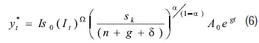 En el estado estacionario, Is * = 1 y Ω* = 0, las tasas de crecimiento de y (y = Y/L), k (k = K/L) y A son constantes e idénticas, es decir, un estado de equilibrio en donde tanto la producción por trabajador como el capital por trabajador crecen a la misma tasa en la que se produce el cambio tecnológico, igual a g. A partir de ello se deriva la función de acumulación de capital en el estado estacionario;