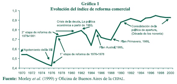 Si se analiza la historia económica argentina de las tres décadas anteriores, se podrían distinguir dos etapas, en las cuales el impulso hacia las medidas de reformas económicas fueron verdaderamente profundas. La primera tiene que ver con la instauración del nuevo esquema económico en 1976, que significó una salida definitiva del proceso de industrialización por sustitución de importaciones (ISI). La segunda se produce a finales década de los ochenta y comienzo de los noventa con una fuerte profundización del modelo de 1976 o de las intenciones que aquél tenía.1