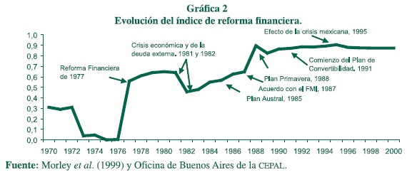 Ambas etapas de reformas profundas (finales de los setenta y los noventa) han culminado con serias crisis económicas y sociales. La primera culminó en crisis, sobre todo a raíz de una conducta puramente especulativa. La segunda, a diferencia, se destacó por provocar una desestructuración económica muy importante, y si bien logró estabilidad en los niveles de precios, todo el programa económico sólo pudo ser sustentado por un exponencial endeudamiento externo, el cual no supo ser utilizado para planificar y amortiguar los efectos de la importante reestructuración económica que produjo la apertura comercial y la fijación cambiaria.