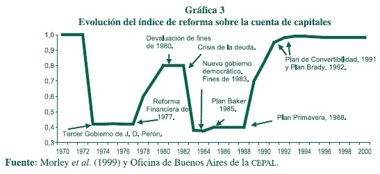 Acerca de la cuenta de capitales, se pudieron observar dos fenómenos críticos para la economía, uno es que la deuda externa soberana se incrementa notablemente, deuda que encuentra como destino principal la cobertura del déficit primario del gobierno. Sumado a ello, en cada periodo de crisis, en los que se provocaría una fuerte devaluación de la moneda, se observó una intensa fuga de capitales, lo que produjo un notable empeoramiento en la redistribución de la riqueza. Esto fue así tanto en la crisis de 1980-1981 como en la ocurrida a finales de 2001, ambas luego de una fuerte apertura de la cuenta de capitales que se conjugaba con un intenso endeudamiento público y posterior devaluación de la moneda, ante la imposibilidad de mantener el esquema cambiario instaurado.
