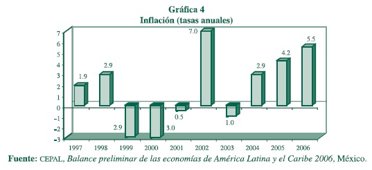 Los incrementos de salarios y pensiones sumados al aumento en las cotizaciones de diversos bienes y servicios en el mercado formal (huevo, arroz, café, electricidad y tarifas de transporte) han contribuido al crecimiento de las ventas minoristas y de la circulación monetaria colocando la tasa de inflación a 5.5% en 2006 (CEPAL, 2006:205), pero en una economía con precios intervenidos y dos segmentos de mercado claramente diferenciados uno en pesos cubanos no convertibles y cada vez menos relevante, y otro en dólares o pesos cubanos convertibles el incremento de precios puede ser mayor. La secuencia porcentual de la inflación para 1997-2007 es posible observarla en la gráfica 4.
