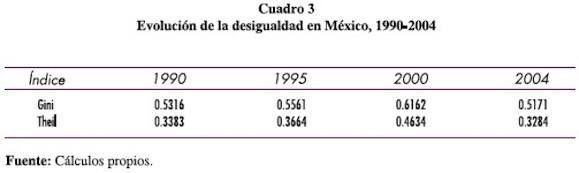 A partir del cuadro 3 se observa una tendencia al incremento de la desigualdad en el país medida por los dos índices. Entre 1990 y 2000, la desigualdad aumentó considerablemente. El índice de Gini pasó de 0.5316 a 0.6162 y el índice de Theil lo hizo de 0.3383 a 0.4634. Esto indica un empeoramiento en la asignación del ingreso en el país.