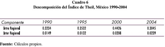 El componente intra-regional es en todos los casos el que mayormente explica la desigualdad de las regiones de México. La tendencia al incremento en el componente intra-regional indica que la puesta en marcha del TLCAN no contribuyó en la década de los noventa a una reducción en la misma. El componente inter-regional muestra un patrón de divergencia económica entre 1990 y 1995. Este patrón cambió entre 1995 y 2000 y se ha prolongado hasta 2004. Sin embargo, es claro que el nivel al que se da esta convergencia de ingresos es insuficiente para compensar el rezago con el que cuenta la región BEG con respecto de EMG y sobre todo de AEG.