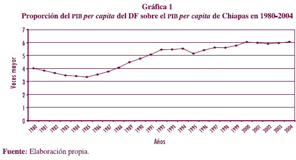 Aquí se desprenden dos importantes observaciones: en primer lugar, para los años de la década de los ochenta la diferencia entre la entidad más rica y la más pobre presentó una tendencia a la disminución y, en segundo lugar, dicha tendencia fue revertida desde finales de esa misma década y principios de los noventa. En este caso, la brecha entre estas economías representativas no solamente dejó de cerrarse, sino que se incrementó de forma sustancial. En los años recientes, la brecha alcanza un nivel de seis veces la diferencia en tamaño de la economía del Distrito Federal en relación con la economía de Chiapas.